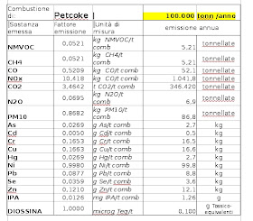 Se vengono rispettati i limiti dell'autorizzazione emessa con decreto 693 del luglio 2008, secondo i flussi di massa avremo i seguenti risultati: Diossine emesse = 1.042.320.000 pg/giorno equivalente alla dose di "tollerabilità" giornaliera (140 pg, secondo l'OMS) di 7.445.142 persone, ovvero una "razione" (si tratta sempre di un calcolo teorico) di 65145 pg/uomo e cioè 465 volte la dose di 140 pg (calcolo riferito a 16000 abitanti, cioè Isola + Capaci) Diossine in ricaduta al suolo: per rispettare il limite di 3.4 pg/m2 (legislazione Belga) è necessaria una superficie di 306.6 Km2 Superfice Isola delle Femmine km2 3,54 Superfice Capaci km2 6,12 Vanadio: 1.17 Kg/giorno; Nichel: 292 gr/giorno; Mercurio: 348 gr/giorno; Altri metalli: 3.48 Kg/giorno Idrocarburi Policiclici Aromatici: 128 gr/giorno Lascio a voi il calcolo mensile ed annuale. Altri parametri (calcolati già da prima dall'ARPA nel 2006): Polveri (totali, non PM10): 686 Kg/giorno S02: 5343 Kg/giorno N02: 16023 Kg/giorno